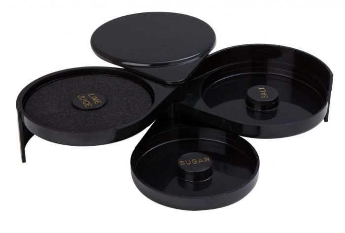 It has a tight fitting lid for secure and convenient storage, that attaches to the bottom of the rimmer when in use and doubles as a non slip tray, avoiding disasters at the bar when preparing drinks.