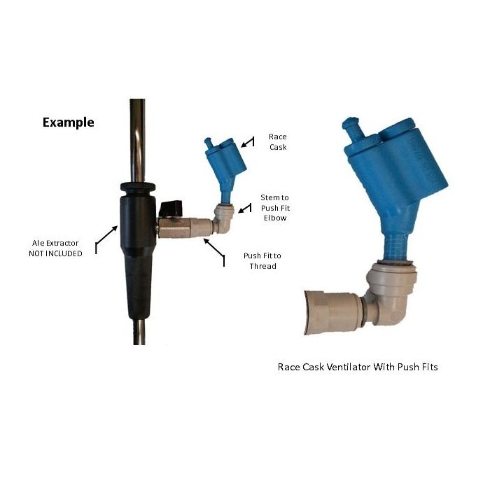The Push Fits with the screw thread fits into your Ale Extractor then the elbow Push Fit allows the Race Cask Ventilator to be positioned upright allowing the bearing to move up and down to regulate air flow.