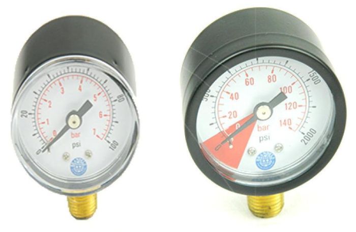 Gauges - one measures line pressure up to 100PSI with a 3/8" inlet, the other gauge is for measuring bottle content, again with a 3/8" inlet.