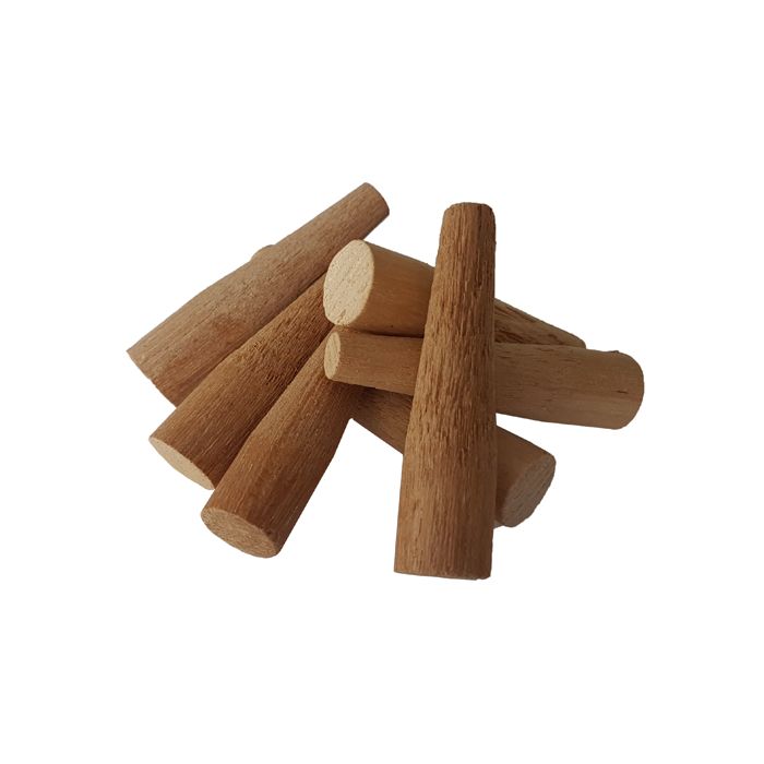 - After harvesting from the forest, the hardwood undergoes several processing stages: precise cutting and bark removal, kiln drying, followed by a second phase of natural air-drying. The wood is then cut into stick form to produce round Hard Wood Spiles (dowels), and shaped to the final specifications of 58 mm in length, 14 mm top diameter, and 7.5 mm bottom diameter.