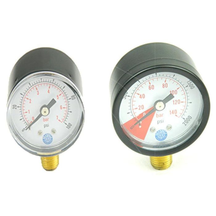 Gauges - one measures line pressure up to 100PSI with a 3/8" inlet, the other gauge is for measuring bottle content, again with a 3/8" inlet.